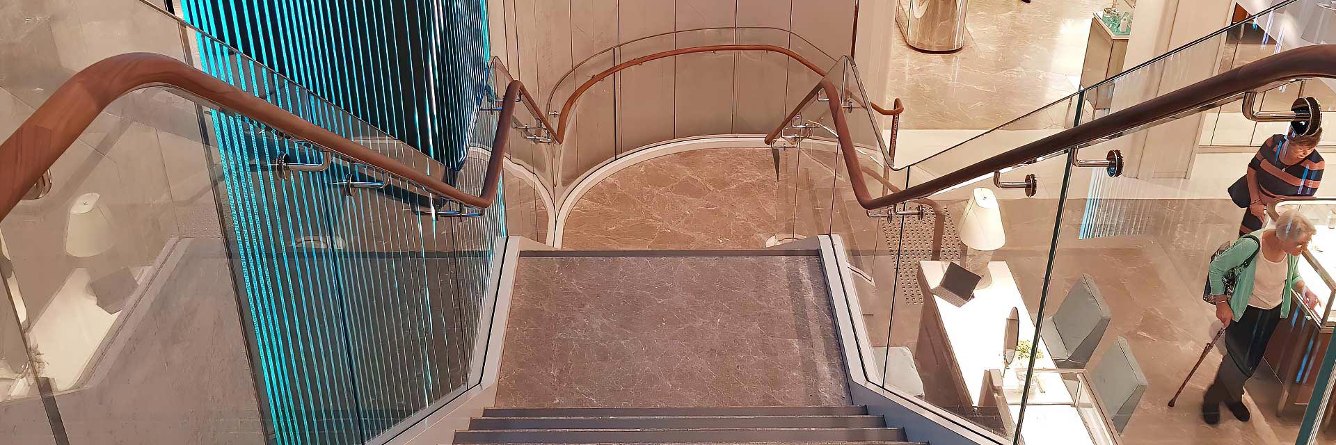 Having been involved in two previous store refurbishments in Melbourne and Auckland, Glasshape® was well-acquainted with the quality, craftsmanship and style desired by Tiffany & Co. Glasshape® was honoured to digitally measure, manufacture and supply Stainform Pty Ltd with TemperShield® low-iron, bent & flat, toughened (tempered) and laminated glass for their main stair and balustrade requirements, at 22mm (7/8″) thick with radius’s as tight as 157mm (6 1/8″), the results are stunning!
